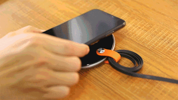 またもう1つの特徴が給電用のケーブルです。この「Womax」はQiワイヤレス送電パットとしては馬頭らしくケーブル一体型の送電パットになります。ですから収納する時はケーブルは取り外す事はできずケーブルが邪魔になるはずなのですが、この「Womax」では本体にくっついているマグネット式のベルトを使いケーブルを巻き取ってホールドしておく事ができますのでケーブルが邪魔になると言う事もありません。