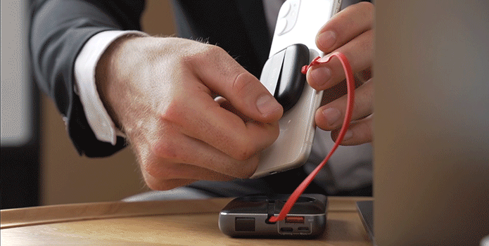 ケーブルは巻き取り式なので持ち運ぶ時にケーブルが邪魔になったりもしませんし、スマートフォンを充電する時はケーブルを伸ばして充電し、「SINEX」そのものはポケットやバッグに入れておけば手に「SINEX」を持たなくても良いのです。