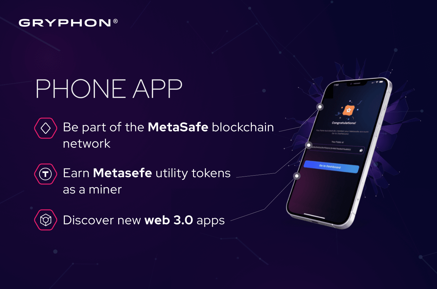また”MetaSafe Passport”は$1/月のサブスク費用が発生し、その収益は”MetaSafe”と言う仮想通貨として「GRYPHON 6E」オーナーに配布されますし、「GRYPHON 6E」を所有しているオーナーはGRYPHONアプリを使う事でマイニングを行い、仮想通貨”MetaSafe”を増やす事もできます。
