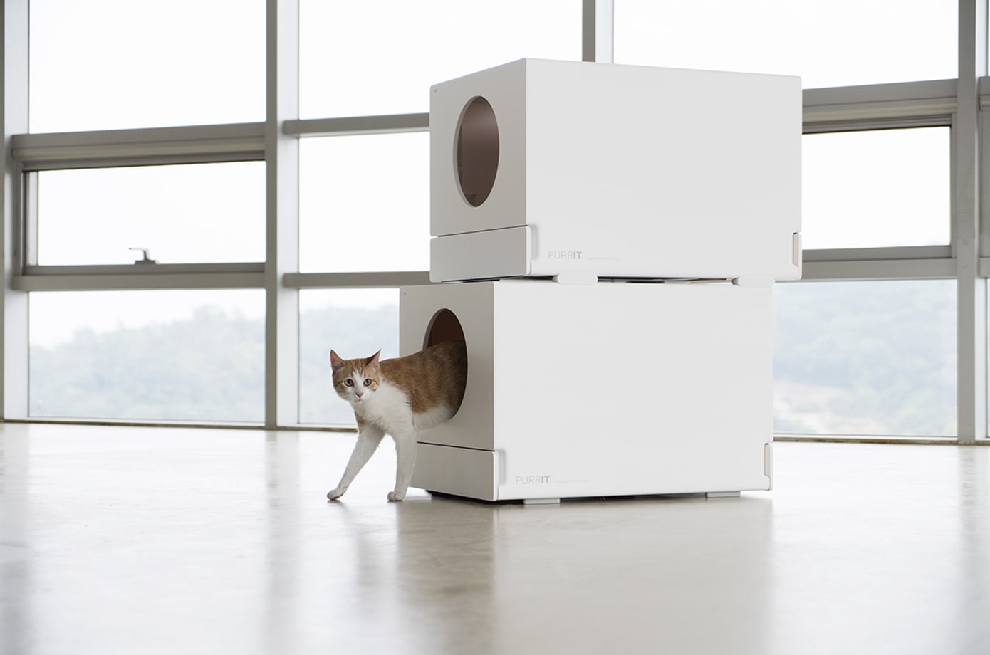 今回紹介するネコ用全自動トイレは、従来の全自動トイレの殆どが球形なのに対して長方形であるため、上に積み上げる事ができる様になっているのが特徴です。