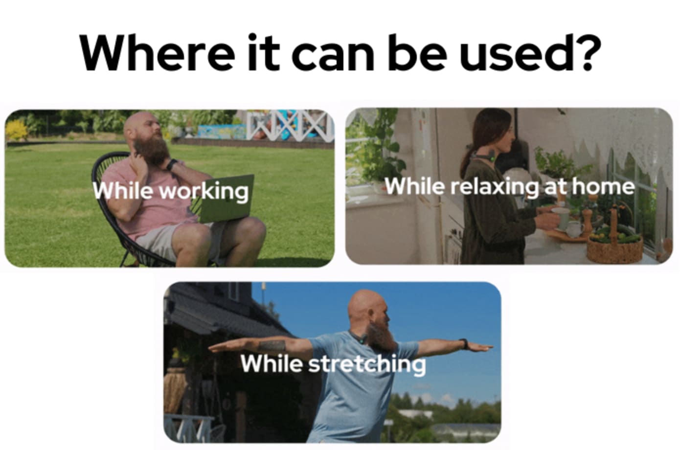次にこの「Pulsetto」の実際の使用方法ですが、まずスマートフォンに予め専用のアプリをインストールしておき、まず3つあるメニュー(将来的には5つに増加)から現状に合ったメニューを選択し、そして「Pulsetto」の電極に付属の導電性ジェルを塗った後に首に巻き付けるだけです。