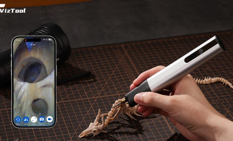 今回紹介する「Viztool」は、原理的にはカメラを内蔵した”耳かき”と同じで、リューターの先端に内蔵したカメラで先端ツールの先端部分と、そしてこれから加工する素材を撮影し、その撮影した映像をスマートフォンやタブレットなどを使って拡大表示させて作業が行える、老眼の方にはとっても嬉しい工具となっています。