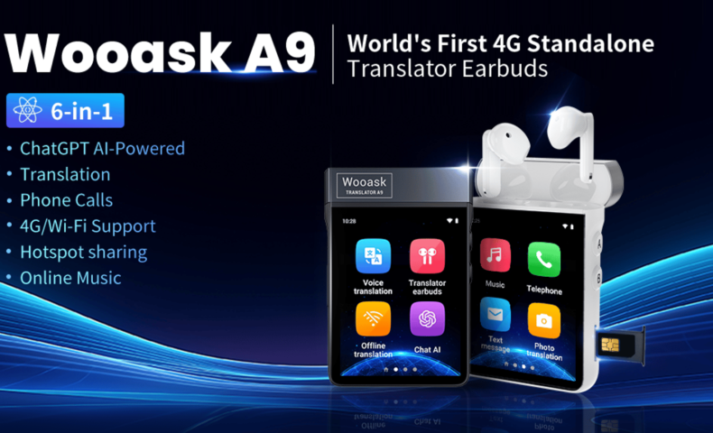 今回紹介する「Wooask A9」は、スマートフォンにワイヤレスイヤホンが内蔵された、はたまたワイヤレスイヤホンにモニターがついた感じの複合機になっており、これ単体で翻訳が行えると言うのが最大の特徴です。
