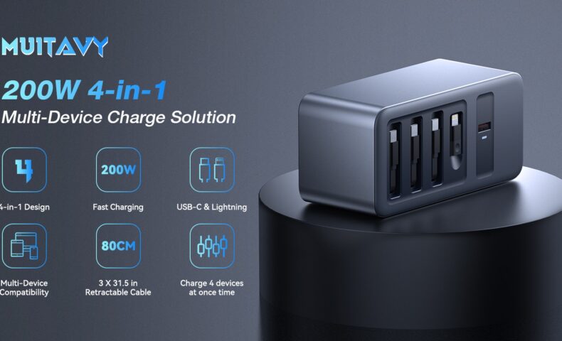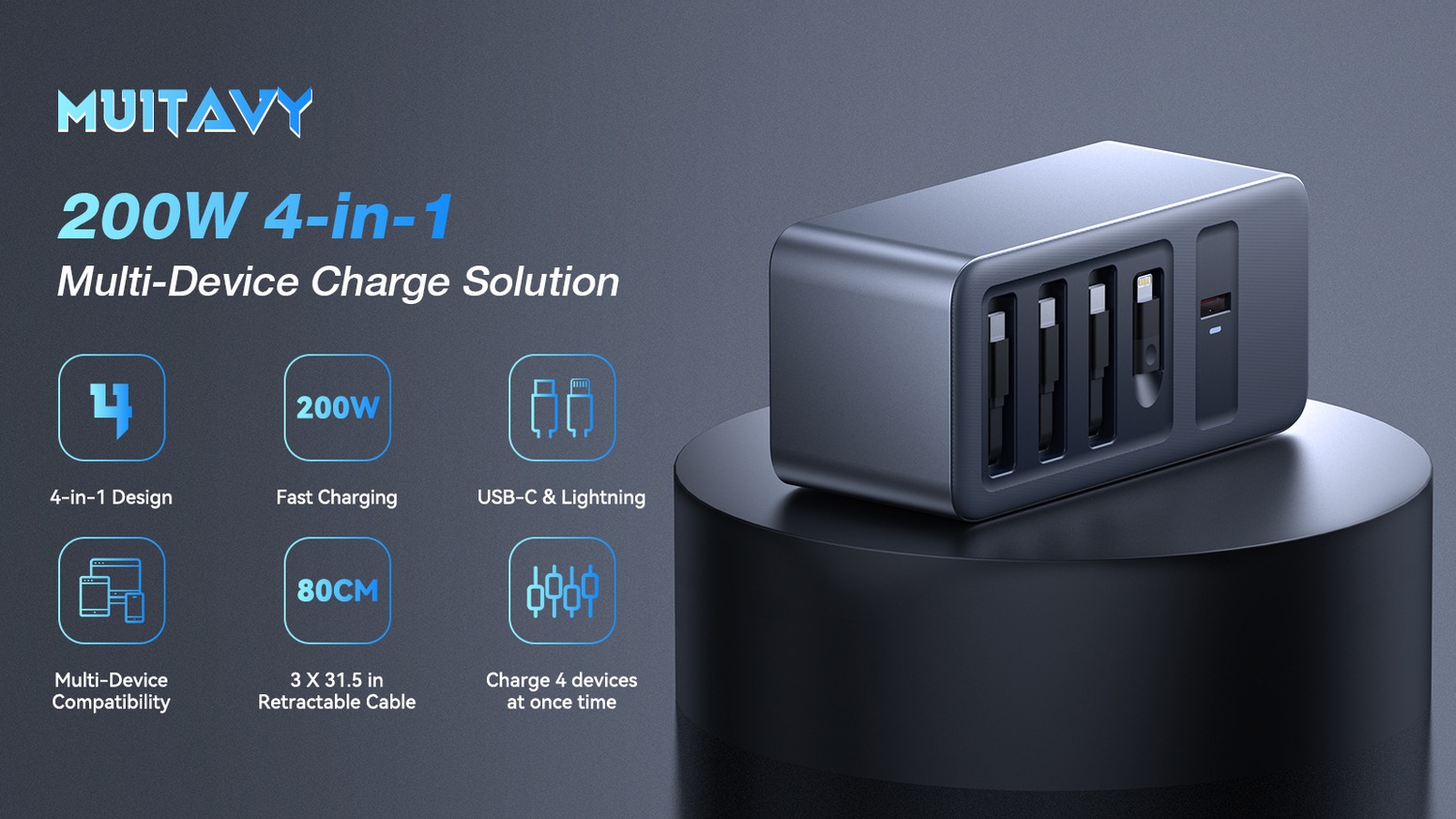 次にこの充電器「MUITAVY Charge Box」の充電性能ですが、UBS-Cポートは3ポートあるのですが、どのポートもUSB-C PD規格で最大で100Wの出力があり、ノートPCなども急速充電する事が出来ますし、トータルの出力は200Wありますので、2ポートを使ってノートPCを2台充電するのであれば、どちらのノートPCもUSB-C PDにて100Wで充電する事が出来ます。