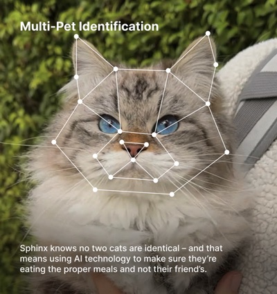 次にこの「Sphinx」にはカメラが搭載されており、顔認証機能によってネコの顔を見分ける事ができ、個別に餌を給餌する事が出来る様になっているのですが、餌に関してはタイマーであげる事も出来ますが、給餌機の前に愛ネコが来ると誰が来たのが飼い主のスマートフォンへ通知が行く様になっており、タイマーでセットされた時間でなくてもアプリを操作する事で餌をあげたりする事が出来る様になっています。