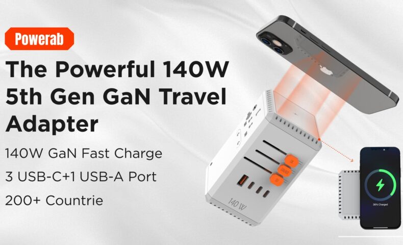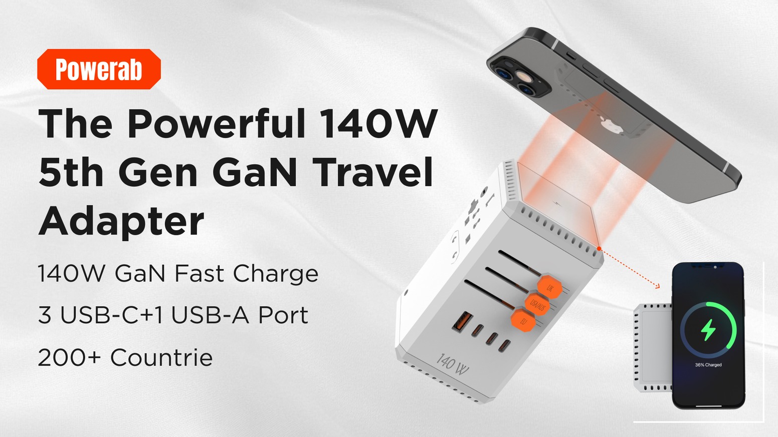 次にこのトラベルアダプタ「Powerab Travel Adapter」にはGaNパワー半導体を使った電源回路を内蔵しており、合計で最大140Wの出力を備えています。