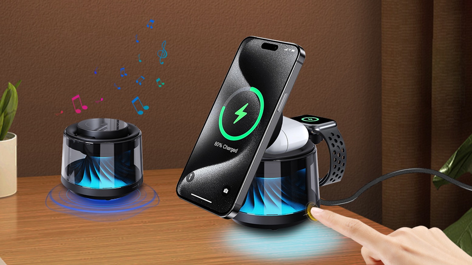 もし迫力のあるサウンドで動画なども常に楽しみたいと言う方にBluetoothスピーカーを搭載したワイヤレス充電台「VoltaBeam」をご紹介致します。