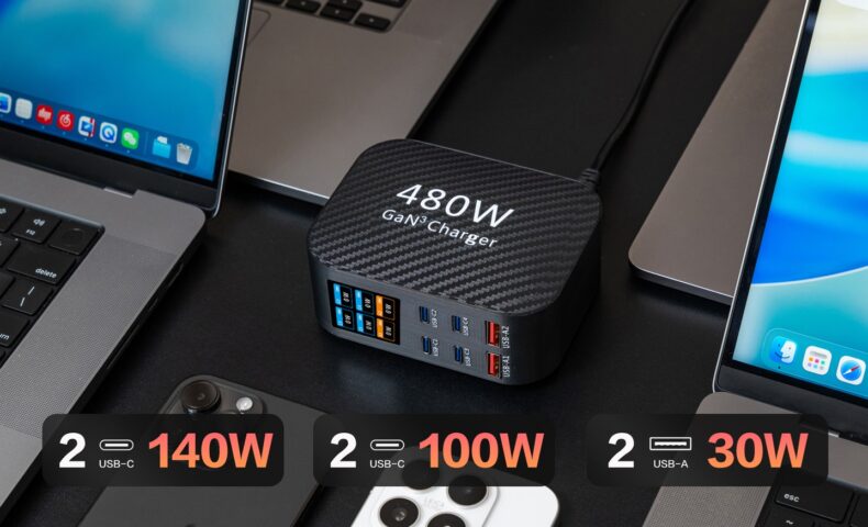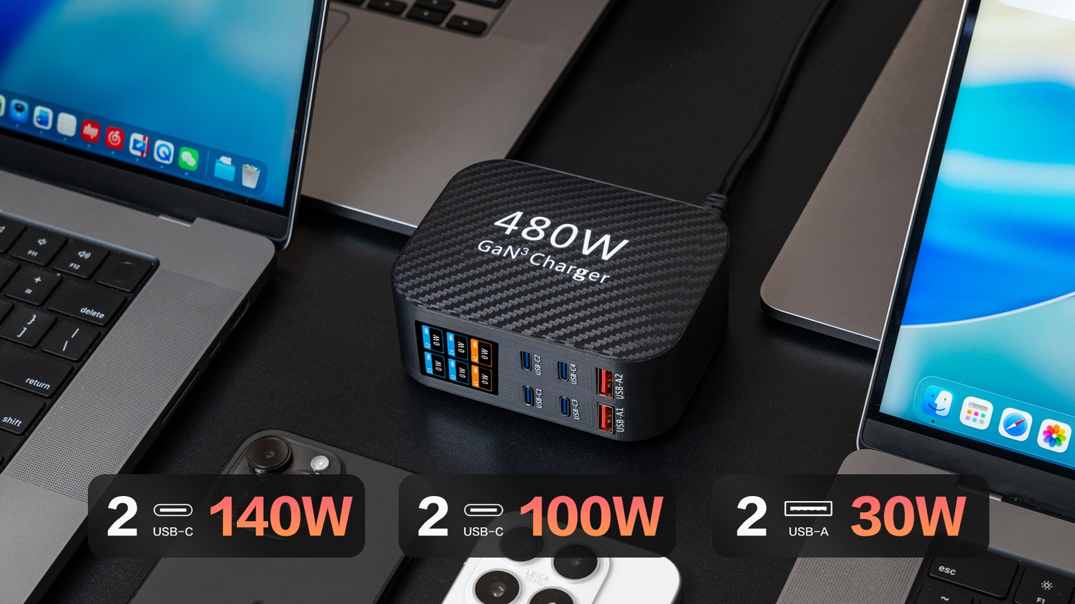 しかもUSB-Cポートを4ポート備えており、2ポートはUSB-C PD(Power Deliver)規格で最大140Wでの出力が可能ですし、残りの2ポートどちらもUSB-C PDで最大で100Wでの出力が可能なのですが、合計出力が480Wもある事で、4つのUSB-Cポートを同時に使用したとしてもどのポートも出力を抑える事なく最大出力で電力を給電することが出来る事で、どのポートも出力を抑える事なくフルパワーで4台全てのPCを急速充電することが出来ますので、複数のノートPCを使われていたり、チームでPCを使って共同作業を行うと言った場合、このUSB充電器は1つで4台ものデバイスを充電することが出来ますので、非常に便利だと言えます。