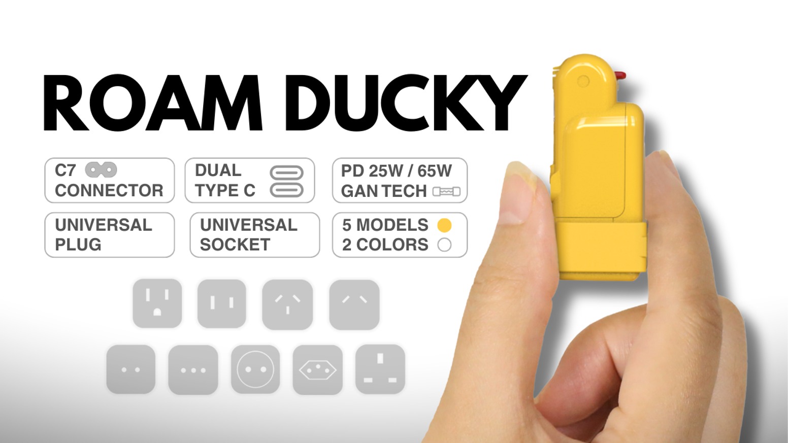 1つ目の”Roam Ducky GO”はユニーバーサルプラグで、2つ目の”Roam Ducky MINI”は”Roam Ducky GO”と同等性能のプラグを搭載した最大出力25WのUSB-C PD充電器で、3つ目の”Roam Ducky NEO”は25W USB-C PD電源に脱着できる”Roam Ducky GO”がセットになった製品になります。
